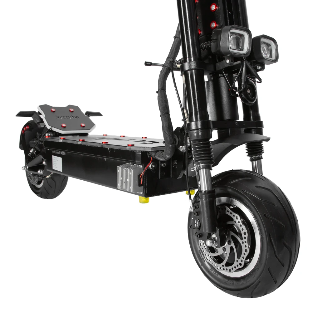 Гидравлические дисковые тормоза с рекуперацией эффективны на сухом и мокром (путь 4-5 м), воздушная подвеска спереди и сзади с регулировкой снижает вибрации; LED-фару, стопы и подсветку видно за 300 м. BMS предотвращает перегрев, переразряд и КЗ аккумулятора. Рекомендации: шлем, защита суставов, скорость ниже 60 км/ч в городе, проверка тормозов и шин раз в неделю.​