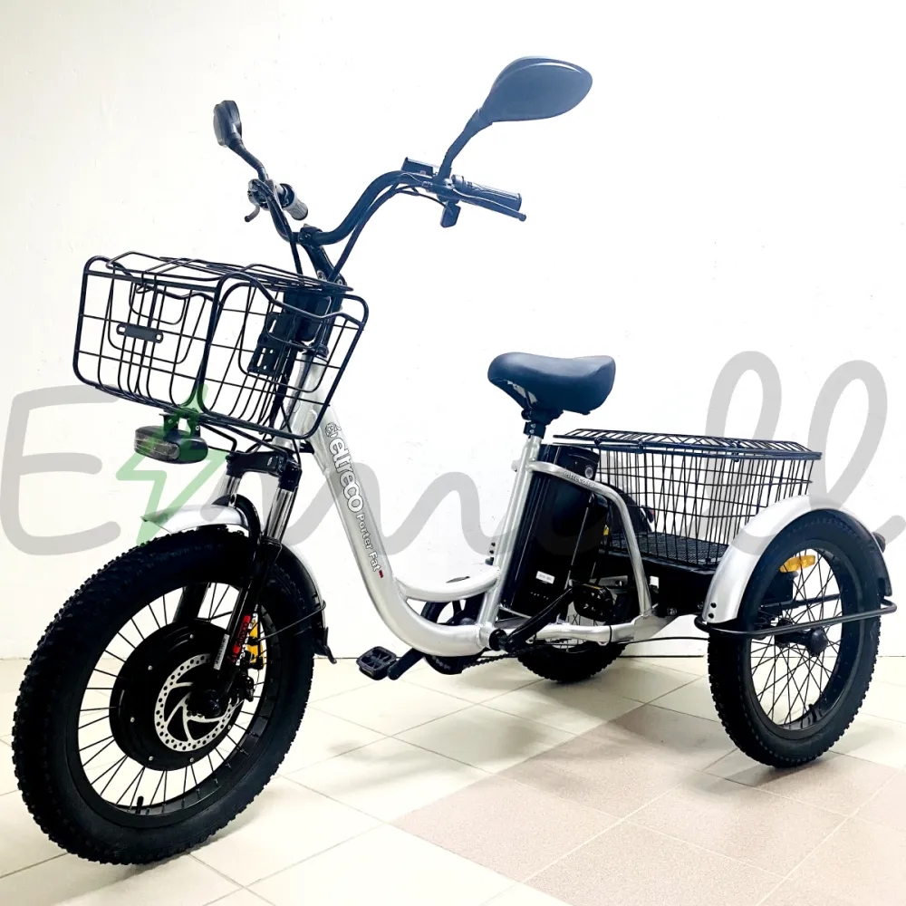 Трицикл Eltreco Porter Fat 500 UP! Серебристый – брендовая модель появилась в продажах в этом году. Техника понравилась отечественным пользователям и ездокам из СНГ. Трехколесный трицикл идеальное решение транспортировки вещей на даче, поездки за покупки по магазинам, прогулок с детьми в парковой зоне.