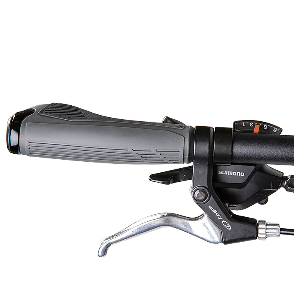 Удобная форма руля регулируется по высоте и углу наклона. Наличие передних амортизаторов делает езду плавной, сглаживает тряску рулевой части при езде по кочкам и другой проблематичной местности. 27,5-дюймовая часть с двойными ободами выглядит везде проходимой. Наличие спортивной манетки для переключения скоростей упрощает процесс переключения 8-скоростного режима. Чтобы повысить или понизить скорость необходимо нажимать на специальный рычажок, что достаточно просто.